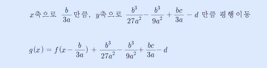 4. 이제 3에서 구한 변곡점이 원점(0, 0)이 되도록 평행이동 시켜 보겠습니다. 이동시킨 함수는 f(x) 함수와 다르므로 g(x)라고 하고, 위에서 언급한 함수의 평행이동 개념을 이용하면 다음과 같이 정리할 수 있습니다. 즉, f(x)의 변곡점을 아래와 같이 평행이동시키면, g(x)의 변곡점은 원점이 되며, 다음과 같이 표현할 수 있겠습니다.