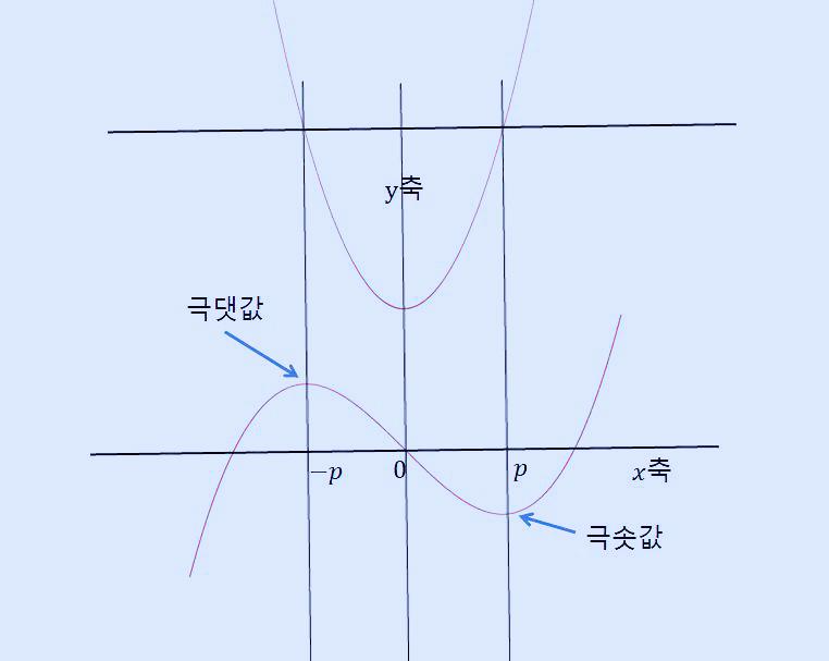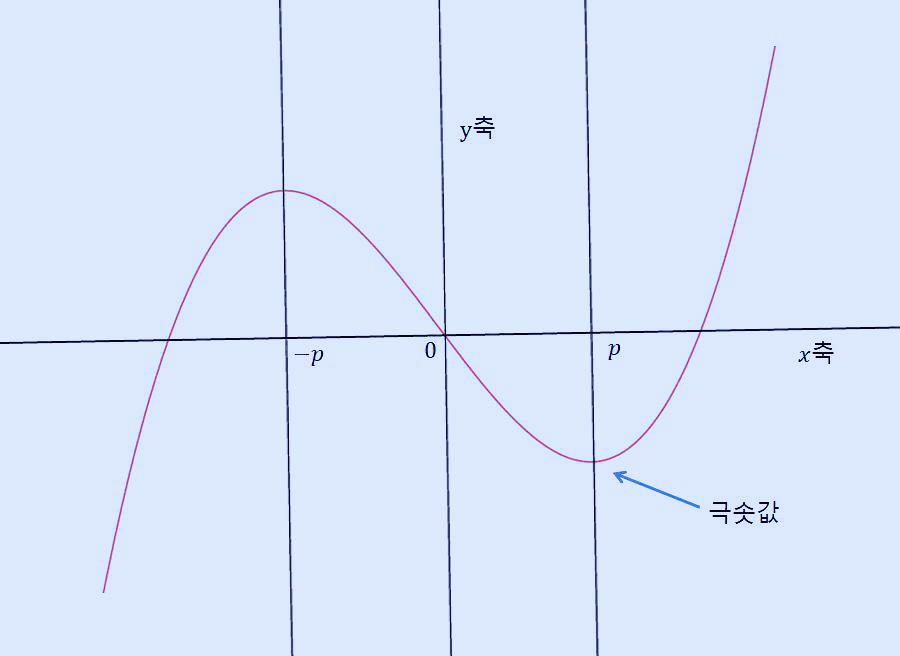 위 그래프에서 극솟값의 x 좌표를 p라고 하면 극댓값의 x 좌표는 -p가 됩니다. 삼차 함수는 변곡점에서 점대칭이기 때문에 아래와 같은 모습이 됩니다.