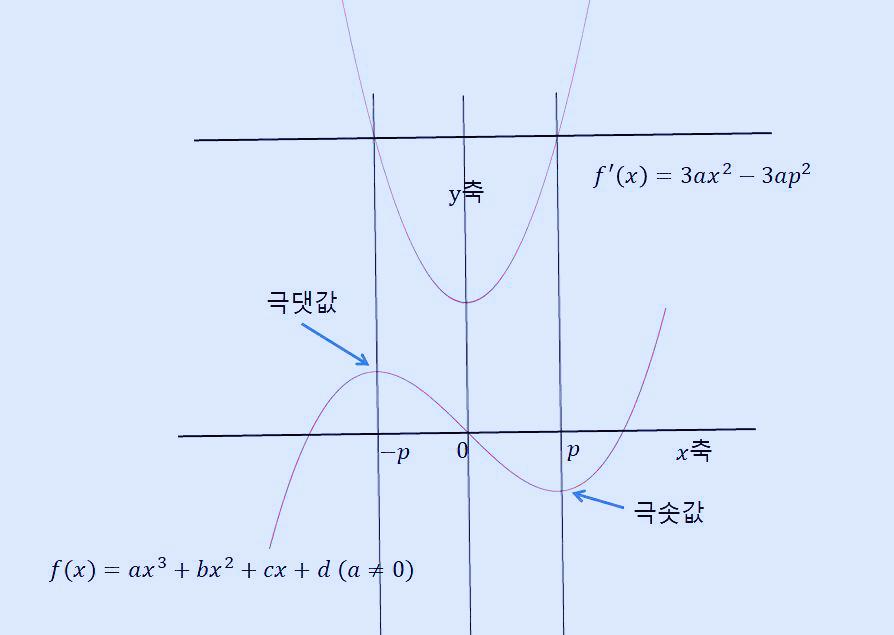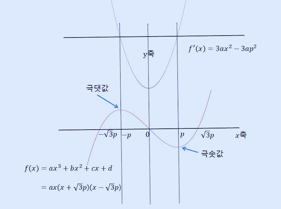 위 그래프를 삼차식과 이를 한번 미분한 값은 한 근이 p, 다른 한 근이 -p이고 2차 계수가 a이므로 이를 p로 정리하면 다음과 같이 쓸 수 있습니다.