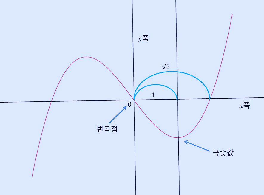 이제 다 구했습니다. 위 그래프를 보면 변곡점(원점)에서 극솟값과 극댓값까지의 거리는 각각 p가 되고, x축과 만나는 두 점까지의 거리는 각각 루트 3p이므로 이를 비율로 나타내면 다음과 같이 계산할 수 있습니다.