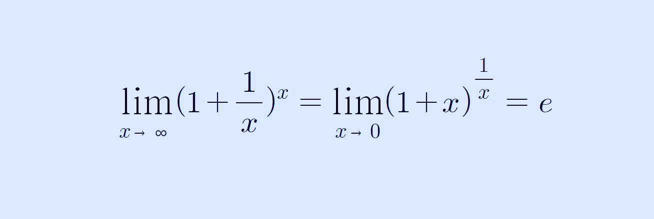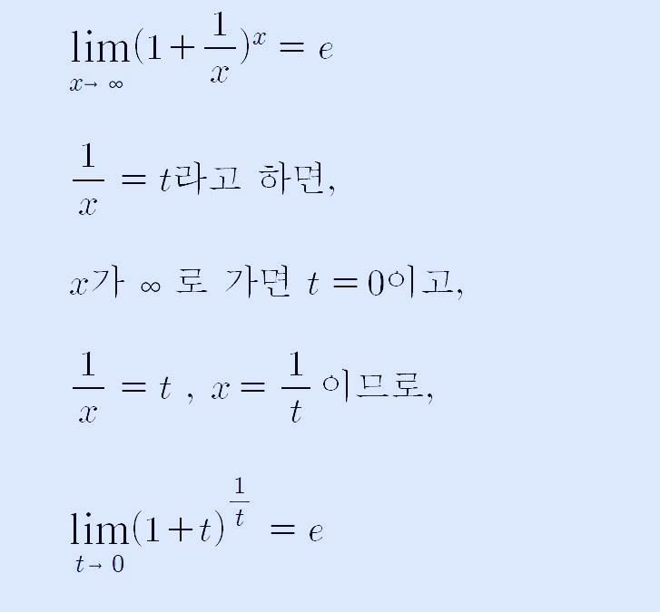 위의 식에서 t를 문자 x로 둔다면 결국 무리수 e는 다음과 같이 두 개의 식으로 정의할 수 있겠네요.
