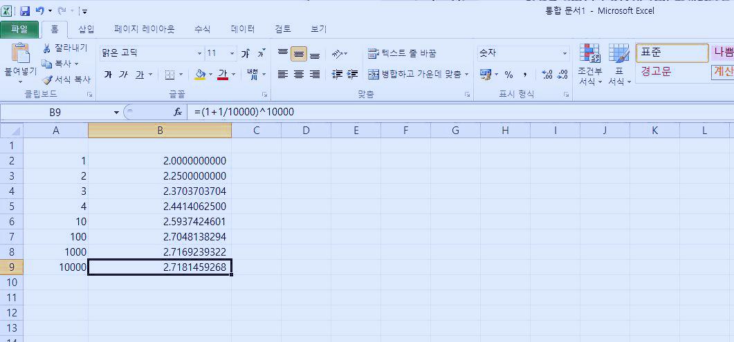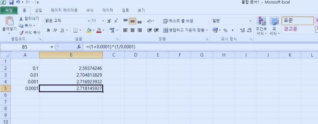 위 식은 처음 제시한 것과 약간 차이가 있습니다. 먼저, x가 0이 아닌 무한대이며, 괄호 안에 1 다음의 수가 x분의 1로 역수이며, 지수 또한 x로 처음 식과는 역수 관계가 있네요. 이 식에서 x 대신에 1, 2, 3, 4, 100을 대입해서 숫자를 계산해 보겠습니다. 이번에도 엑셀 프로그램을 이용해 봅니다.