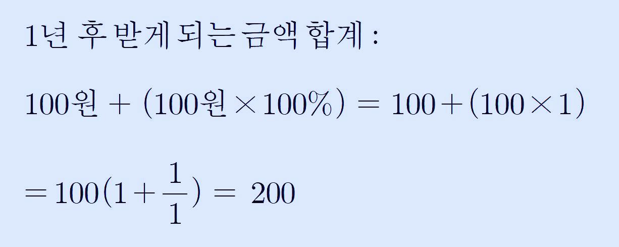 예를 들어, 제가 100원을 1년간 은행에 100%인 이자로 맡기면 1년 후에는 100원의 100%의 이자는 100원이므로 저는 200원을 받게 되겠네요. 이를 식으로 나타내면 다음과 같이 쓸 수 있을 겁니다.