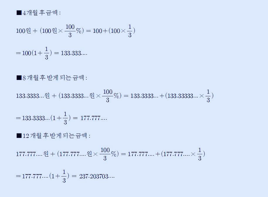 만약에 일 년에 4개월마다 한 번씩, 3번에 걸쳐서 위와 같은 방식으로 계산해 보면 다음과 같습니다. 아래 식을 보면, 마지막 237.203... 원은 1 더하기 3분의 1이 세 번 곱해졌다는 것을 볼 수 있습니다.