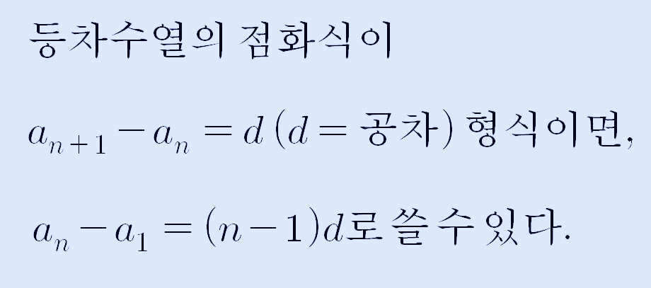위 식은 1/k+1, -1/k가 숫자가 아닌 문자 k가 있을 뿐, 등차수열의 귀납적 정의, 즉 등차수열의 점화식이 될 수 있습니다. 즉, an을 좌변으로 이항하면 등차수열 형식으로 다음과 같이 쓸 수 있습니다.