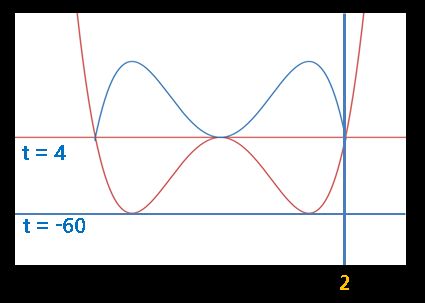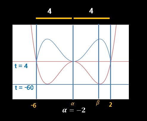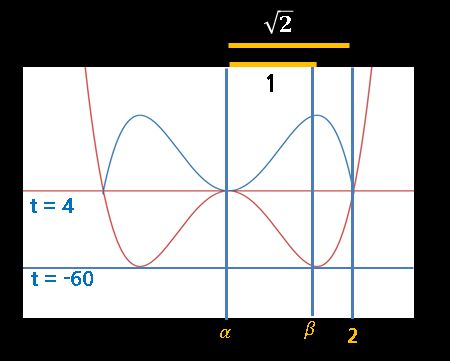 마지막 그래프에서 극댓값과 극솟값의 차이는 64이고, 극댓값과 극솟값의 거리와 극댓값에서 나머지 x좌표까지의 거리 비는 1 대 루트 2이므로 다음과 같이 표현할 수 있습니다.