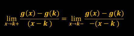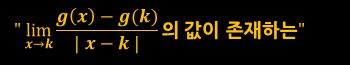 위 조건에서 분모에 절댓값이 있으므로 절댓값이 양수인 경우와 음수인 경우로 나누어서 생각합니다. 양수이면 x→k+, 음수이면 x→k-인 경우이고, 양수면 분모는 x-k, 음수이면 -(x-k)가 되며, 값이 존재해야 하므로 두 극한값은 같아야 합니다. 또한, 절댓값이 0이라면 g'(k)=0이 됩니다.