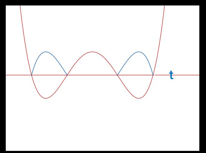 위 조건은 f(x)를 y 축으로 t만큼 평행 이동한 것을 절댓값으로 표현한 말과 같습니다. 절댓값의 다른 말은 t 아랫부분을 꺾어서 위로 올렸다는 말이므로 그래프로 그리면 대강 다음과 같습니다.