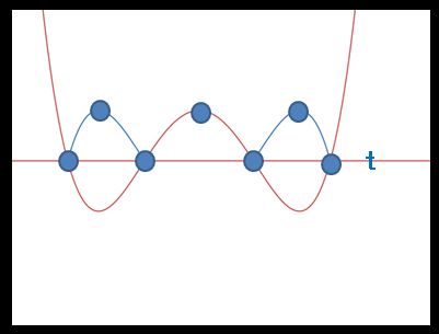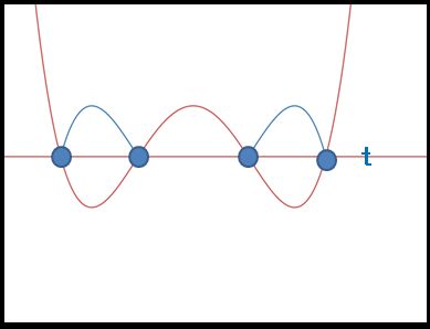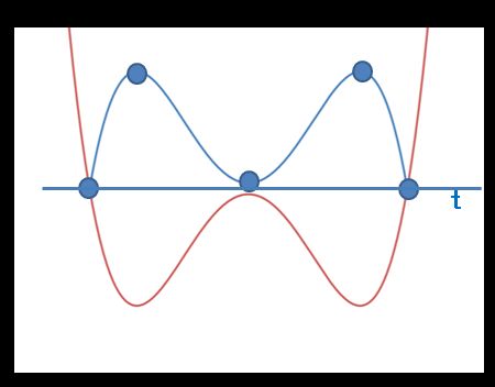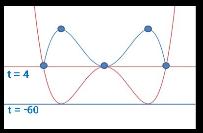 위 그래프에서 g'(k)=0인 곳은 극값을 의미하므로 3개가 존재합니다. 따라서 t가 극댓값과 극솟값 사이에 있다고 하면, 점이 모두 7개가 됩니다.