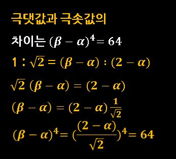 알파와 베타 값을 구하기 위해서는 사차함수 비율관계와 사차함수 극대, 극소차 공식을 알고 있다는 전제하에 계속 계산해 보겠습니다.