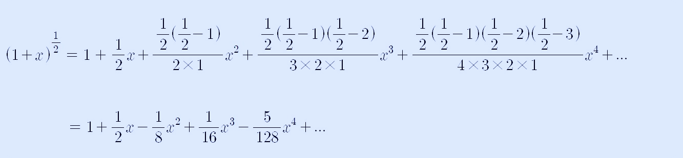 원의 방정식을 y에 대해서 정리했더니 지수가 1/2이 되었기 때문에 위의 이항정리 전개식에서 n을 1/2로 정하고 전개해서 정리하면 다음과 같게 됩니다.